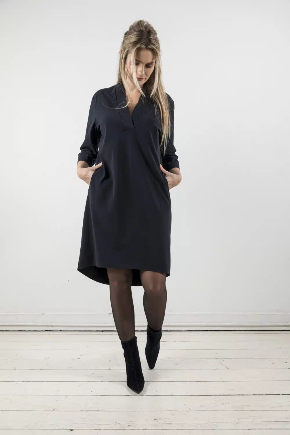 Damesjurk Lesina. Gemaakt van heerlijke travelstof. Deze damesjurk heeft een casual uitstraling met V-hals, ¾ mouw, 2 paspelzakken, verlengde achterzijde en een lengte over de knie. Dit model is leverbaar in de kleuren zwart en marine.