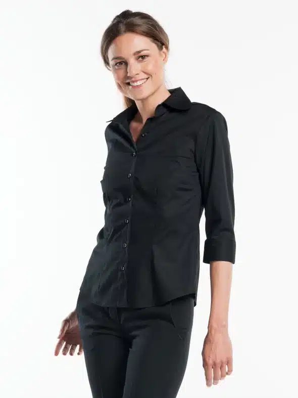 Deze damesblouse is getailleerd en heeft een stijlvolle pasvorm. Het stretch-materiaal maakt de blouse comfortabel om te dragen en blijft tijdloos, mede dankzij de praktische en charmante driekwartsmouwen, perfect geschikt voor bedienend personeel.