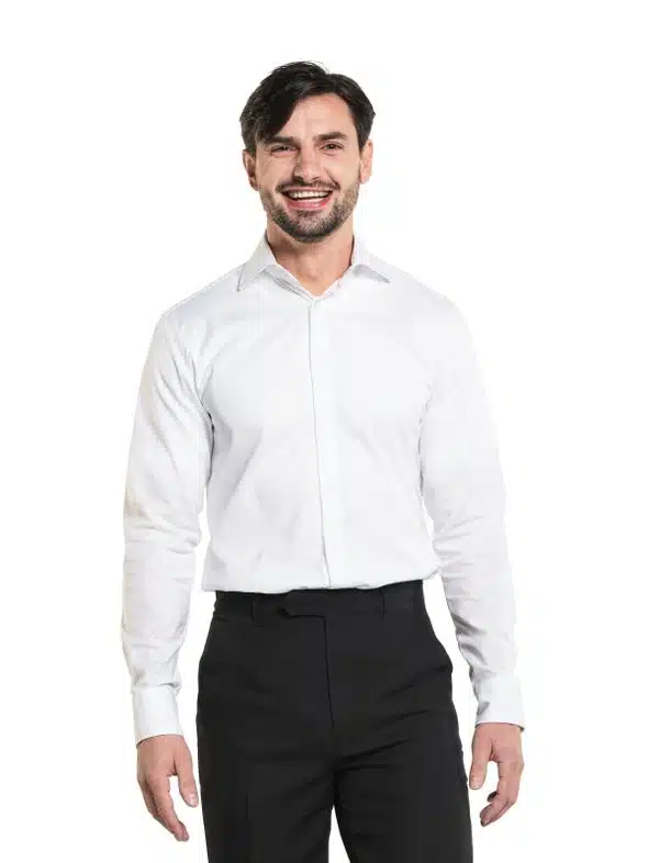 Dit overhemd voor de man is getailleerd en heeft een stijlvolle pasvorm. Het stretch-materiaal, dat tevens industrieel wasbaar is, maakt het overhemd extreem comfortabel en perfect geschikt voor bedienend personeel.
