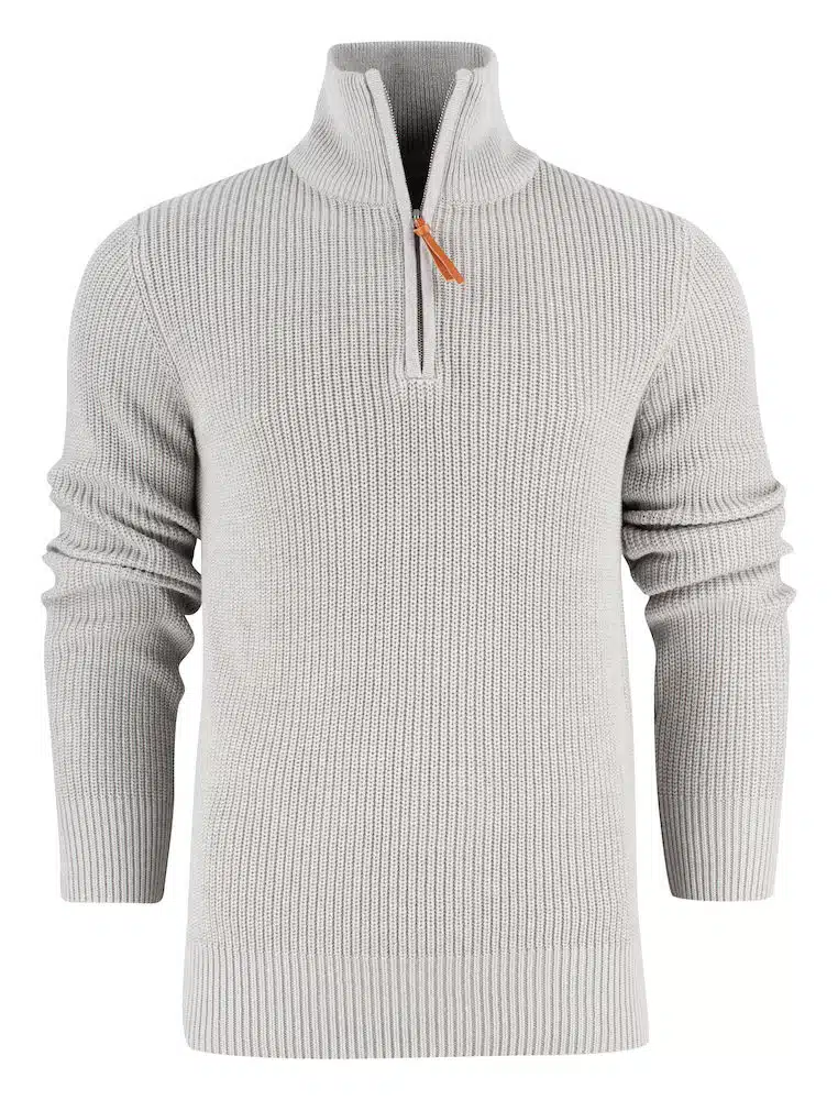 Zwaar gebreide vest. Met korte ritssluiting in metaal met leren zippuller. Elleboogstukken (platgebreid in dezelfde garen) op de mouwen. Ribboord aan de manchetten, de zoom onderaan en de dubbelgelaagde kraag.