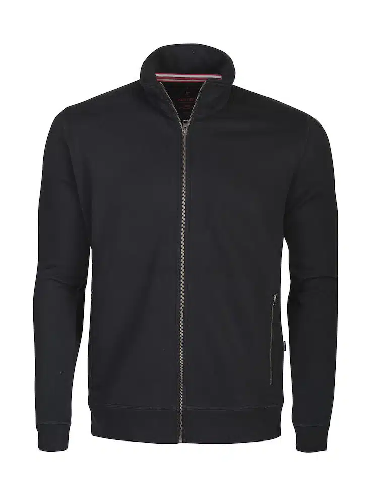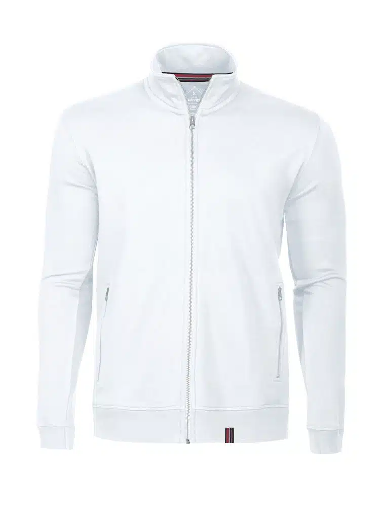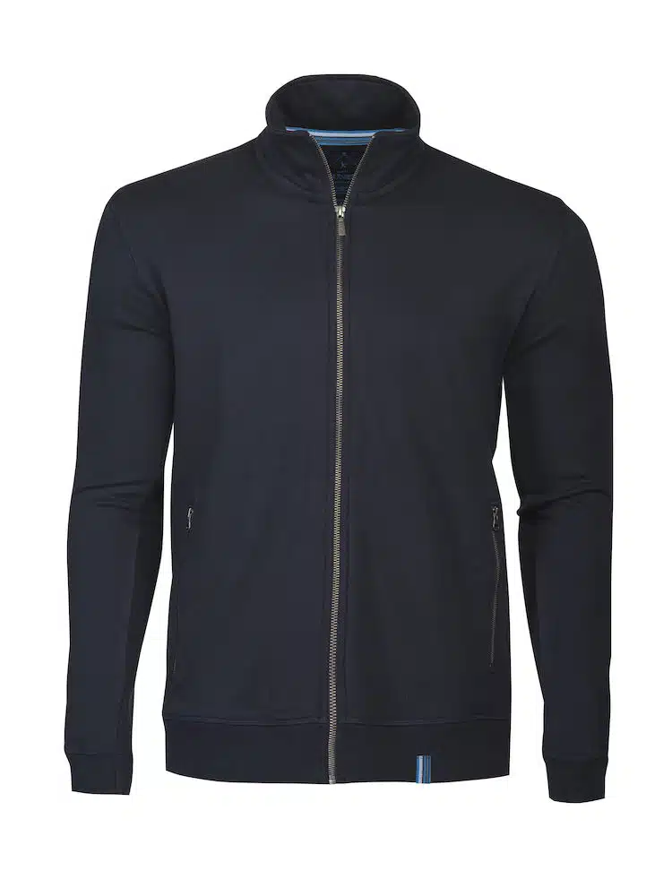 Moderne sweatshirt. Met lange ritssluiting in zware jersey kwaliteit met ongeborstelde binnenkant. Contrasterend en decoratief lint in de nek, aan de binnenzijde langs de ritssluiting en als zijlabel aan de boord onderaan. Zijzakken met ritssluiting en halvemaanvormige nek met geprint label. 1×1 rib met elastaan aan de kraag, manchetten en boord onderaan. Leverbaar in dames en heren model.